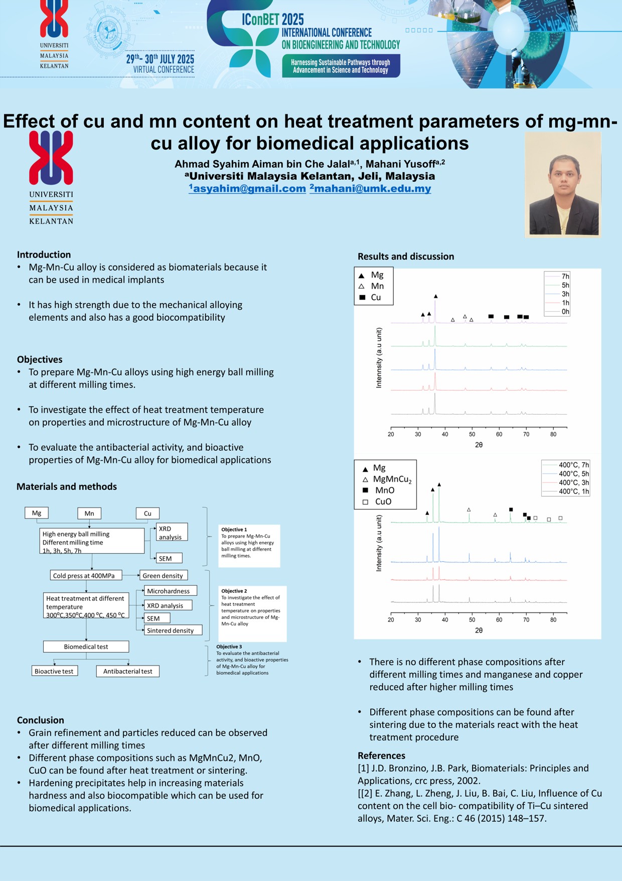 | 3:15 – 3:30 PM | UMK23 Mr. Muhamad Afif Zaafarani Bin Muhamad Aidi Preliminary Study of Tannic Acid Extracted from Kenaf Bast Fiber as Green Corrosion Inhibitor for Aluminium Substrate in Automobile Radiator [Show Abstract] |