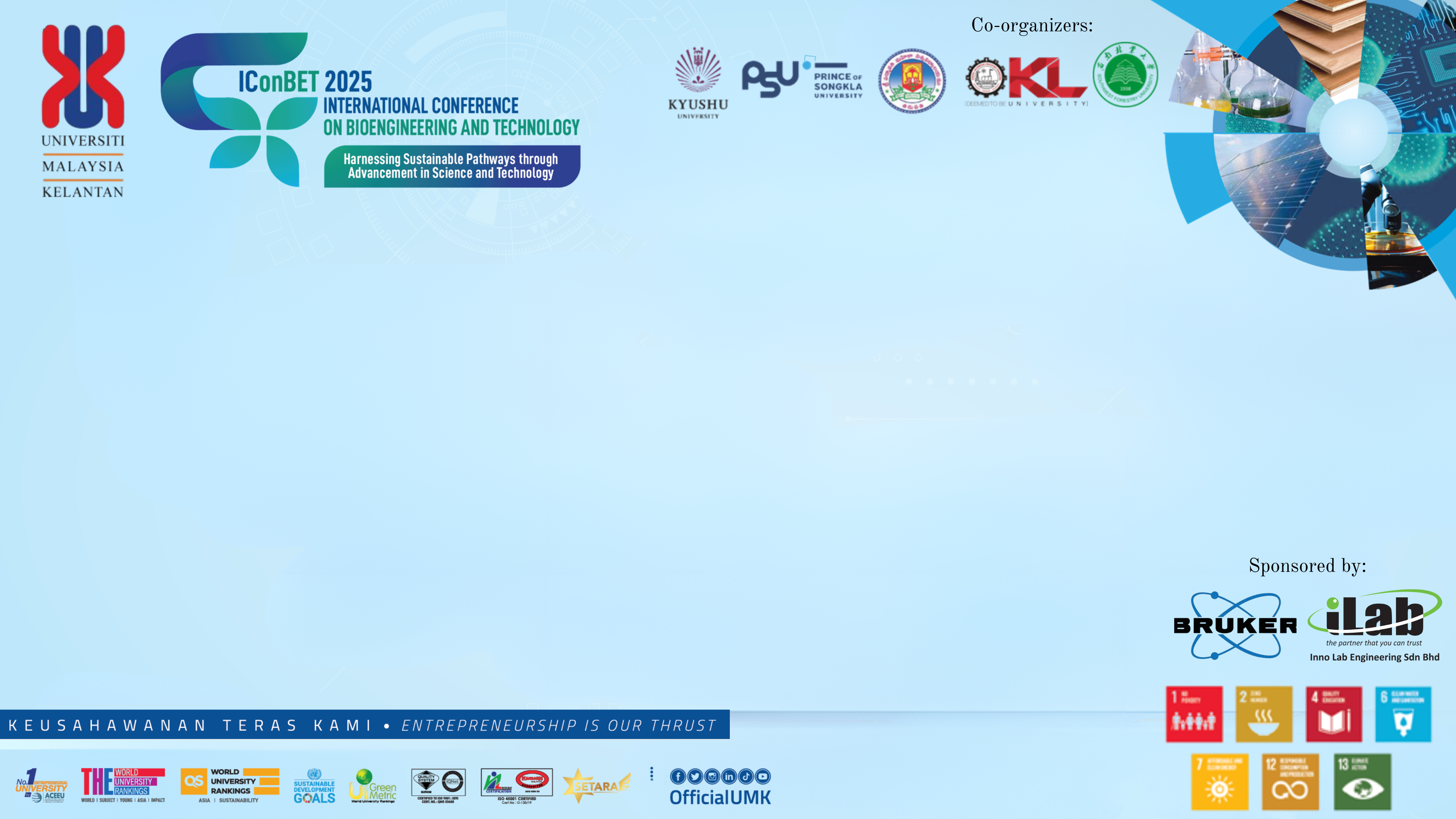 | 4:00-4:15 PM | UMK01 Dr. Zubaidah Aimi Abdul Hamid Extraction, Characterization, and Antimicrobial Activity of Chitosan Derived from Corbicula fluminea (Etok) Shells [Show Abstract] |